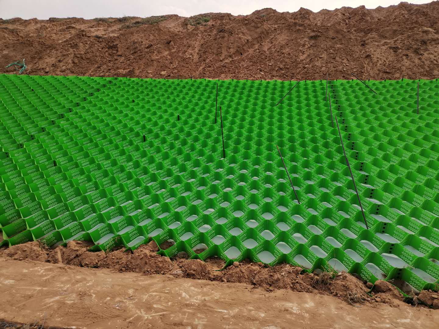 土工格室在排水溝的邊沿點要用錨桿或鉚樁固定住。往意:排水溝須與公路的排水邊溝連接互通,而且錨桿、鉚樁的的高度應(yīng)是土工格室垂直片材的2倍多300到500毫米,確保格室的牢固。并且土工格室有著省施工時間、省人工、省成本的優(yōu)勢,是一種經(jīng)久耐用的環(huán)保